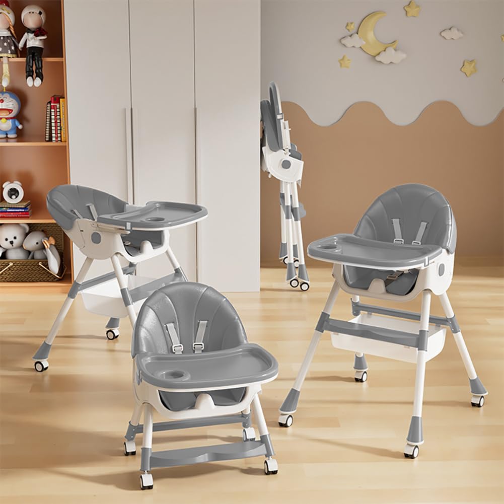 4-IN-1 CONVERTIBLE MOVABLE BABY HIGH CHAIR WITH ADJUSTABLE TRAY, SAFETY HARNESS & UNIVERSAL WHEELS