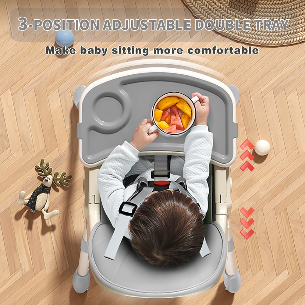 ✔ Double tray system: Designed with convenience in mind, this high chair includes a two-layer removable tray. The top tray is perfect for feeding, while the bottom tray serves as a play area—keeping meals and toys separate and clean. With 3-position tray adjustment and side snap fasteners, it ensures a secure fit and quick changes between uses.