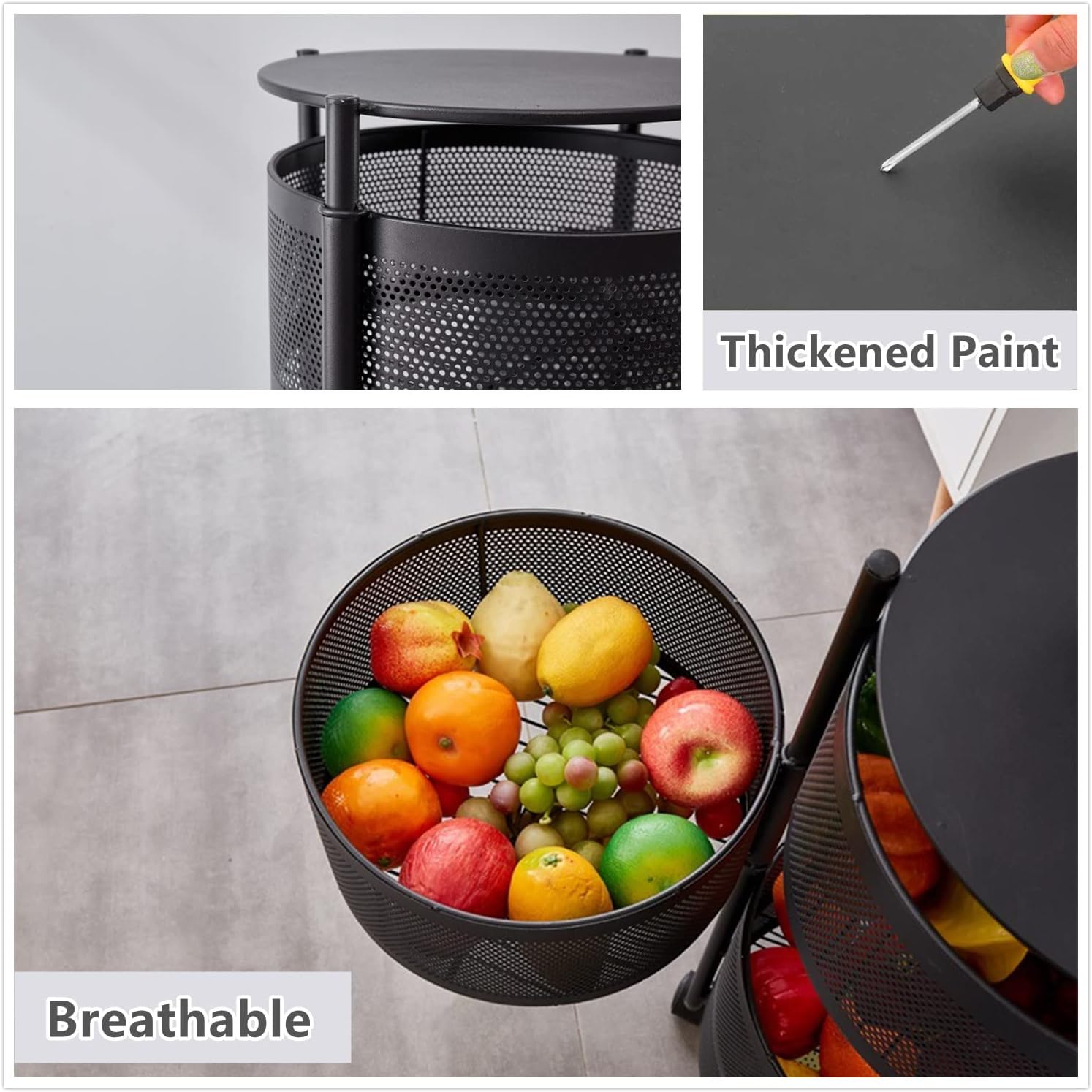 Thanks to its vertical, compact frame and open wire mesh baskets, this rack promotes airflow to keep items fresh and easily visible. The sleek black finish and minimalist look make it a modern addition to any home or office.