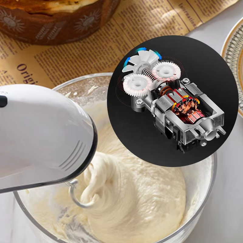 This hand mixer features an ergonomic grip that reduces hand fatigue during extended use. Its lightweight build and compact size make it easy to handle and store in any kitchen.