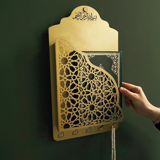 • Special Features: Intricate Islamic geometric patterns, Quran holder, tasbih hooks, premium packaging
