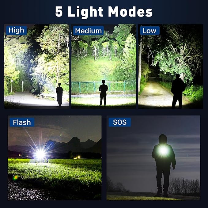 ✔ FIVE ADJUSTABLE LIGHT MODES: Customize your beam with High, Medium, Low, Strobe, and SOS modes, adapting seamlessly to different lighting needs and survival situations.